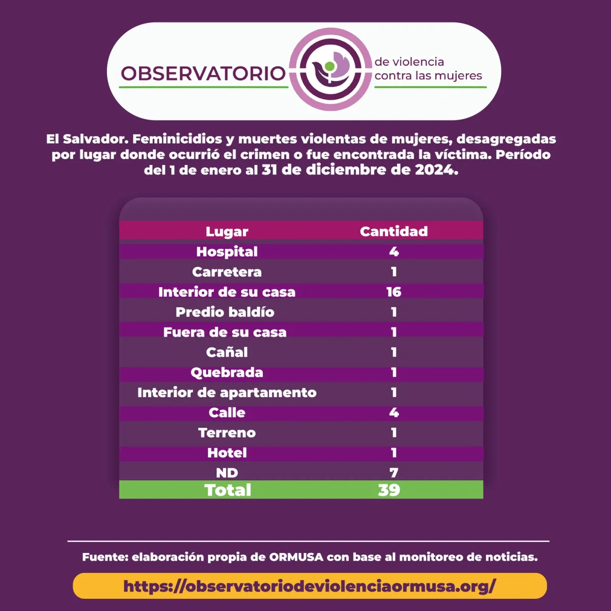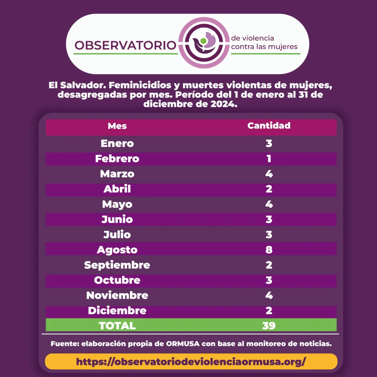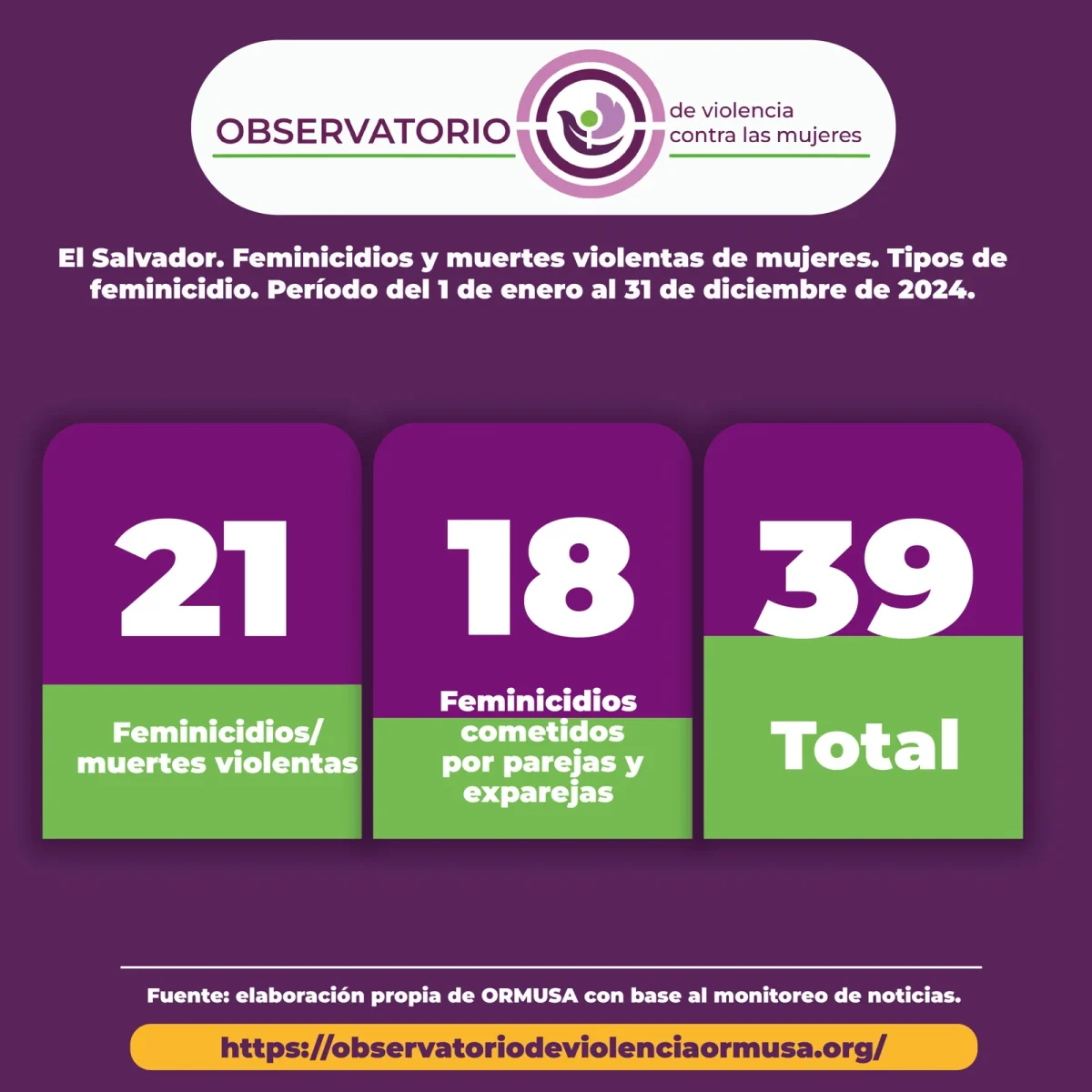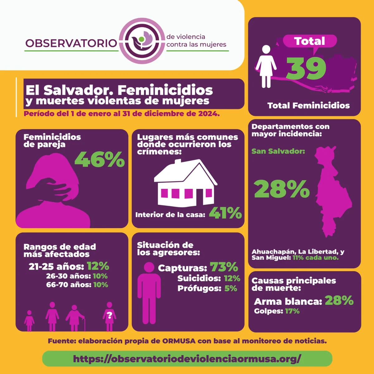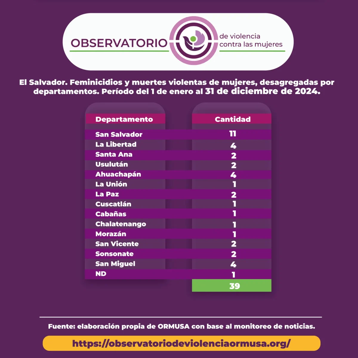 Según el informe de Ormusa, en 2024 se registraron 39 feminicidios y muertes violentas de mujeres, lo que representa una disminución significativa comparado con los 46 casos documentados en 2023. La Policía Nacional Civil (PNC) informó que estos feminicidios representaron el 34% del total de homicidios ocurridos en el período, lo que sugiere un incremento porcentual del 4% en relación con el año anterior.