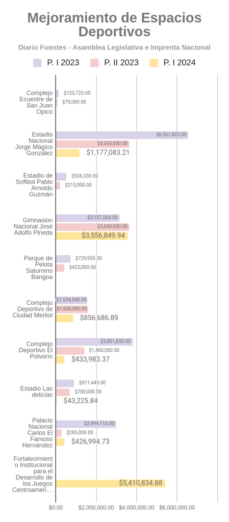 Las nuevas asignaciones presupuestarias contrastan con los montos destinados en 2023 para algunos de estos mismos espacios deportivos. Por ejemplo, el año pasado se asignaron $6,561,025.00 para el Estadio Nacional Jorge Mágico González, mientras que en 2024 se aprobaron $1,177,083.21. Para el Gimnasio Nacional José Adolfo Pineda, en 2023 se destinaron $3,157,560.00, y en 2024 se aprobaron $3,556,849.94.