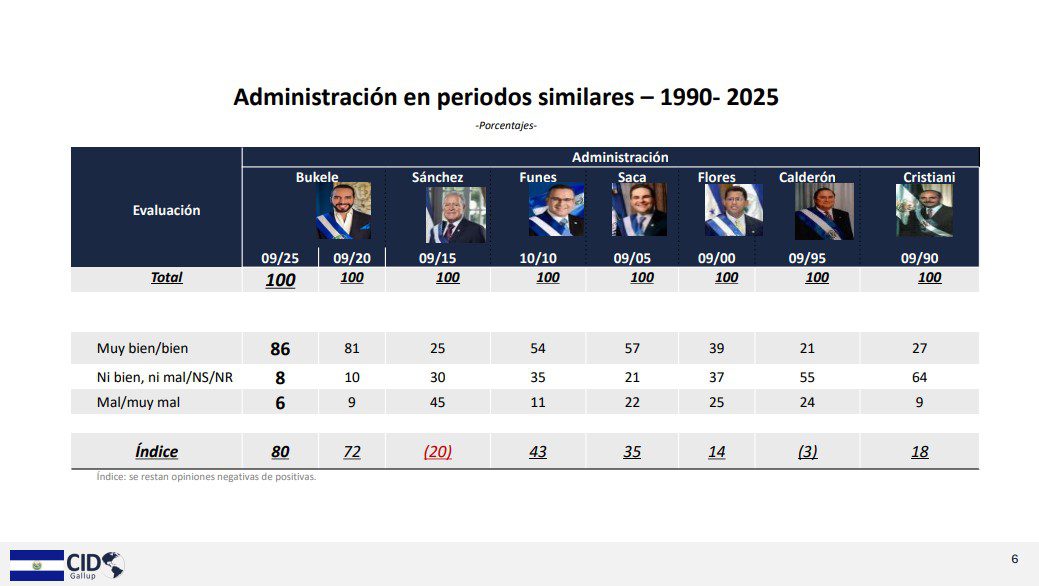 El 6% de desaprobación presidencial registrado en septiembre de 2025 representó el nivel más bajo documentado por CID Gallup durante el periodo de gobierno de Bukele. Luis Haug destacó que “aquí vemos como el presidente Bukele tiene 86% muy bien/bien, únicamente muy mal con un 6% comparado con los otros mandatarios hay una diferencia bastante significativa”. Esta cifra contrastó con el 10% que consideró el rumbo del país equivocado en el mismo periodo, evidenciando una diferencia de 4 puntos porcentuales entre ambos indicadores de desaprobación.
