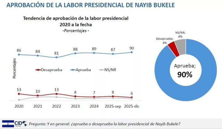 El 85% de percepción favorable sobre el rumbo del país se mantuvo en diciembre de 2025 según la encuesta de CID Gallup presentada el 10 de diciembre, mientras el 10% evaluó negativamente y el 5% no supo o no respondió. La estabilidad respecto a septiembre de 2025 consolidó una tendencia de aprobación superior al 80% durante todo el año. La brecha de 75 puntos porcentuales entre percepción positiva y negativa se mantuvo constante, representando una diferencia 37 puntos porcentuales superior a la brecha de 38 puntos registrada durante la gestión de Félix Cristiani en 1991, y 24 puntos superior a la brecha de 51 puntos durante la gestión de Mauricio Funes en su mejor momento de 2010.