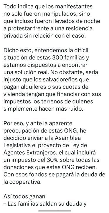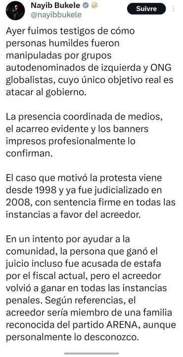 El presidente Bukele utilizó este caso para señalar supuestas influencias extranjeras en asuntos internos. “Vemos cómo organizaciones financiadas desde fuera pretenden defender privilegios de quienes se apropiaron indebidamente de tierras que pertenecen a los campesinos salvadoreños”, publicó en sus redes sociales, vinculando las protestas con lo que denominó “injerencismo extranjero”.