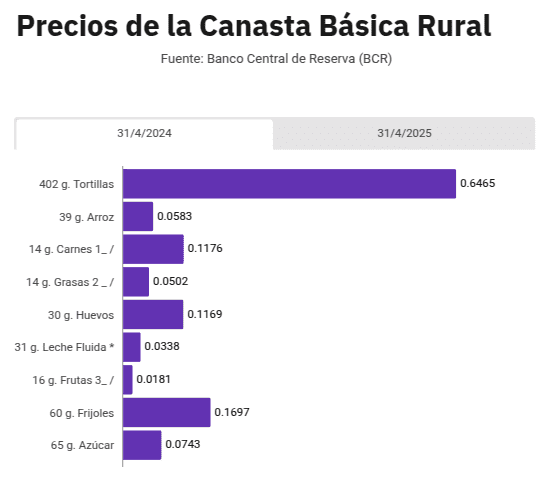 Caen los precios de la canasta básica y los de la inflación, en su comparación interanual. El IPC general cayó de 0.12% entre abril de 2024 y abril de 2025, descendiendo de 130.45 a 130.3 puntos. El sector de alimentos y bebidas no alcohólicas cayó de 155.53 a 154.55 puntos, una deflación de 0.63%. Pero las bebidas alcohólicas y tabaco subieron de 170.83 a 173.26 puntos (1.42%), según datos recientes del BCR.