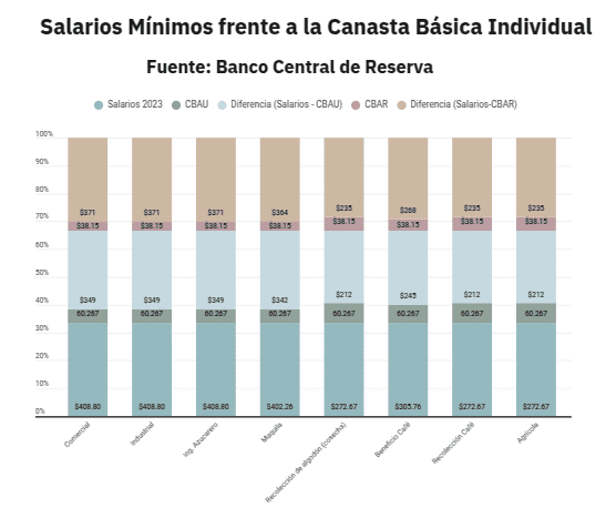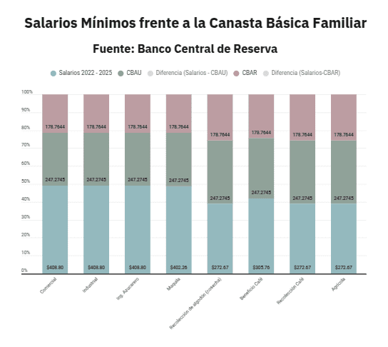 El informe de la UCA establecía que “en abril de 2024, el costo de una CBA para un hogar de 4 personas en la zona urbana era de US$273.68 y, por tanto, la CA era de US$547.36 al mes”, cifra que ahora se ha reducido según los datos actuales.