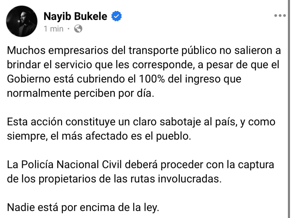 El presidente Nayib Bukele al rededor de las 7 de la mañana, emitió una dura advertencia a los empresarios del transporte público tras la detención de varios dueños de rutas debido a quejas de usuarios por no encontrar rutas de buses en circulación debido al cierre temporal en la Carretera Los Chorros, afectando a miles de usuarios. “A los empresarios del transporte, les repito: o acatan las órdenes del gobierno o se abstienen a las consecuencias. No permitiremos que intereses particulares afecten a la población”, sentenció el mandatario en un mensaje dirigido a los transportistas.
