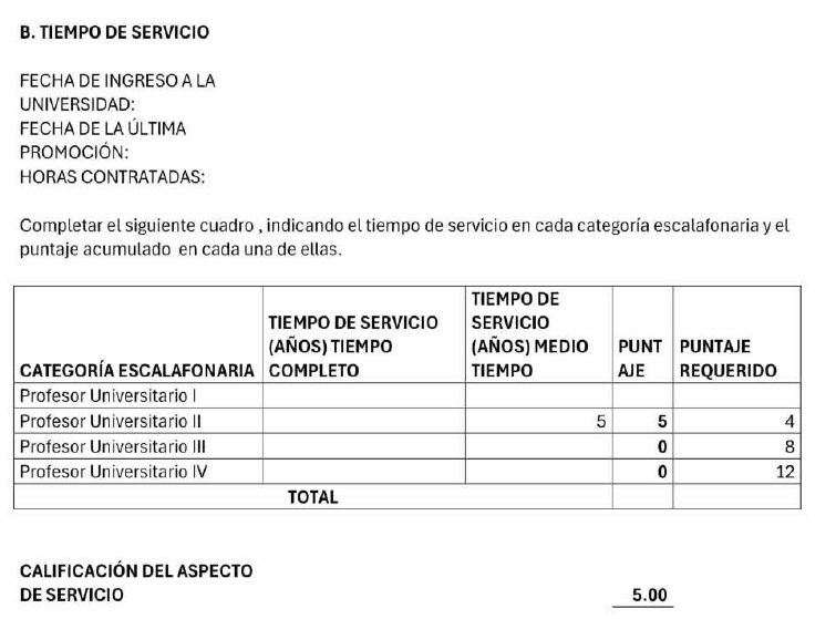No obstante, en Proyección Social registró 0 puntos, pese a ser un área que, según el Reglamento, “debe contribuir a la solución de problemas sociales”; siendo requeridos 3 puntos, para docentes PU II; 6 puntos para docentes PU III y 9 puntos para docentes PU IV. Este vacío contrasta con su desempeño en Especialización, donde sumó 12.50 puntos (frente a 2 requeridos) gracias a una maestría y un curso de más de 240 horas. En Investigación y Publicaciones, obtuvo 1.50 puntos (1 necesario) por una publicación en revista arbitrada con índice de impacto (p. 24).