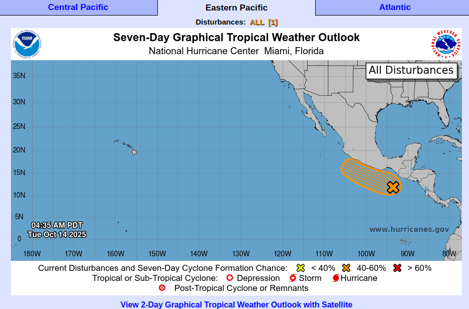 El Centro Nacional de Huracanes emitió la Discusión del Clima Tropical para el océano Pacífico oriental a las 1005 UTC del 14 de octubre de 2025, cubriendo desde los 03.4°S hasta los 30°N al este de los 120°W. “Una onda tropical se localiza cerca de los 96°W entre los 10°N y 17°N, moviéndose hacia el oeste a unos 10 nudos” según el informe del Centro Nacional de Huracanes. “Se observan lluvias y tormentas eléctricas aisladas dentro de un radio de 120 millas náuticas a ambos lados de la onda entre los 10°N y 14°N” precisa el documento técnico.