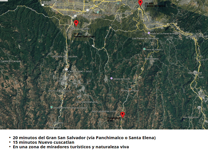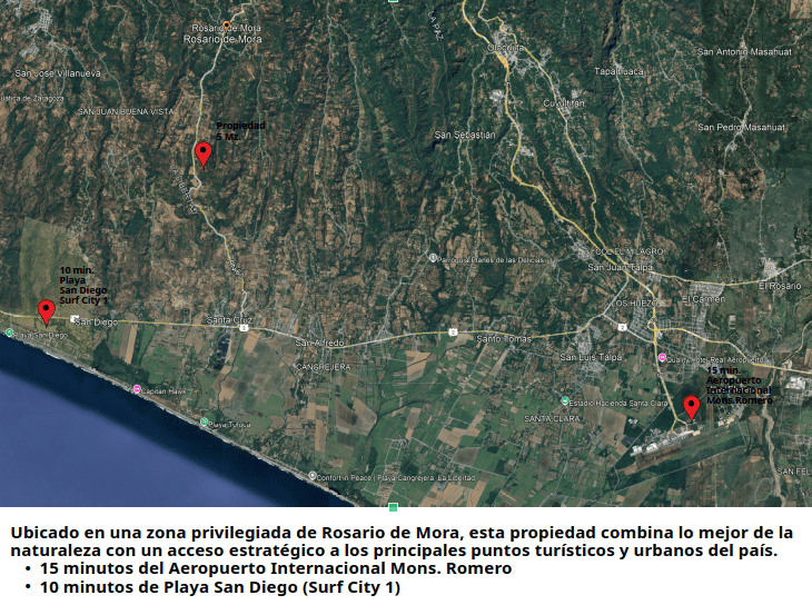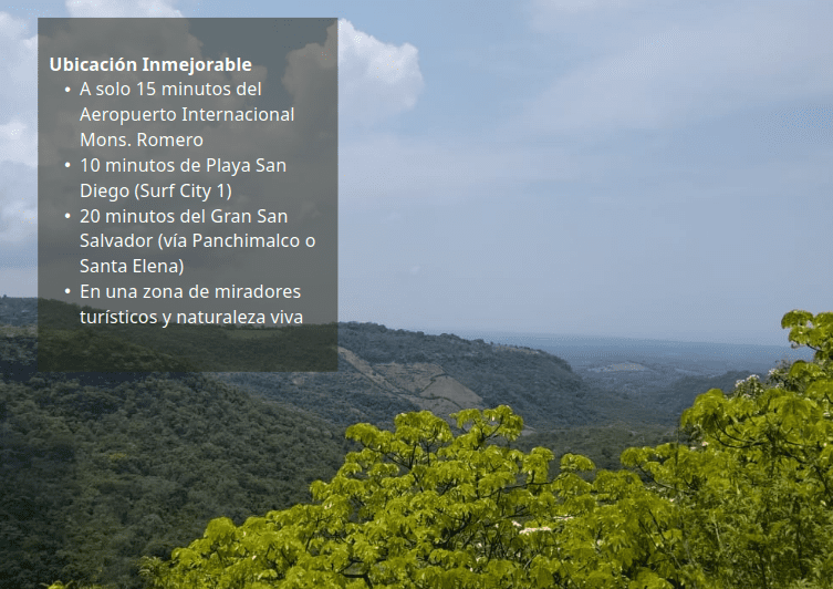 La ubicación es otro de sus grandes atractivos. A tan solo 15 minutos del Aeropuerto Internacional Monseñor Óscar Arnulfo Romero, 10 minutos de la Playa San Diego (parte del proyecto Surf City 1) y 20 minutos del Gran San Salvador, esta propiedad se sitúa en una zona estratégica que combina la tranquilidad del entorno natural con la cercanía a centros urbanos y turísticos. El acceso es versátil, ya que se puede ingresar tanto por la carretera principal como por un acceso lateral, y el terreno ofrece planicies y medias pendientes ideales para construcciones en niveles.